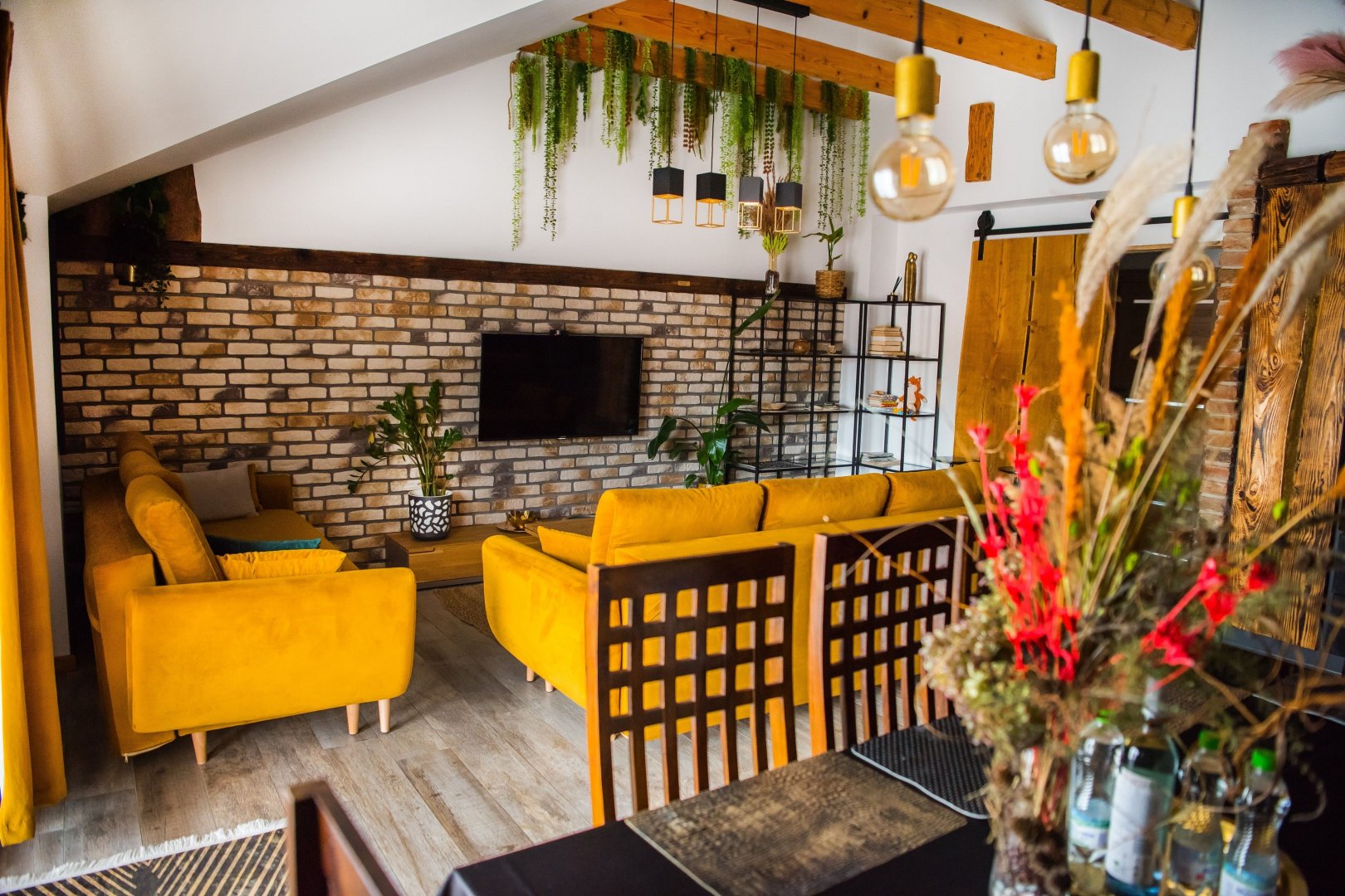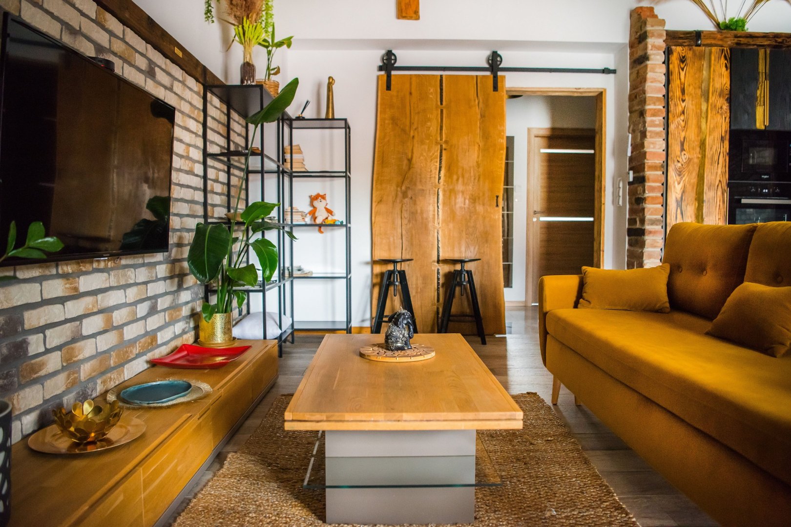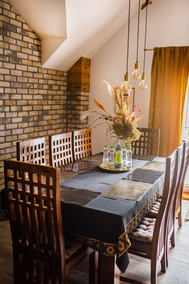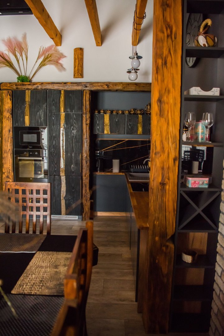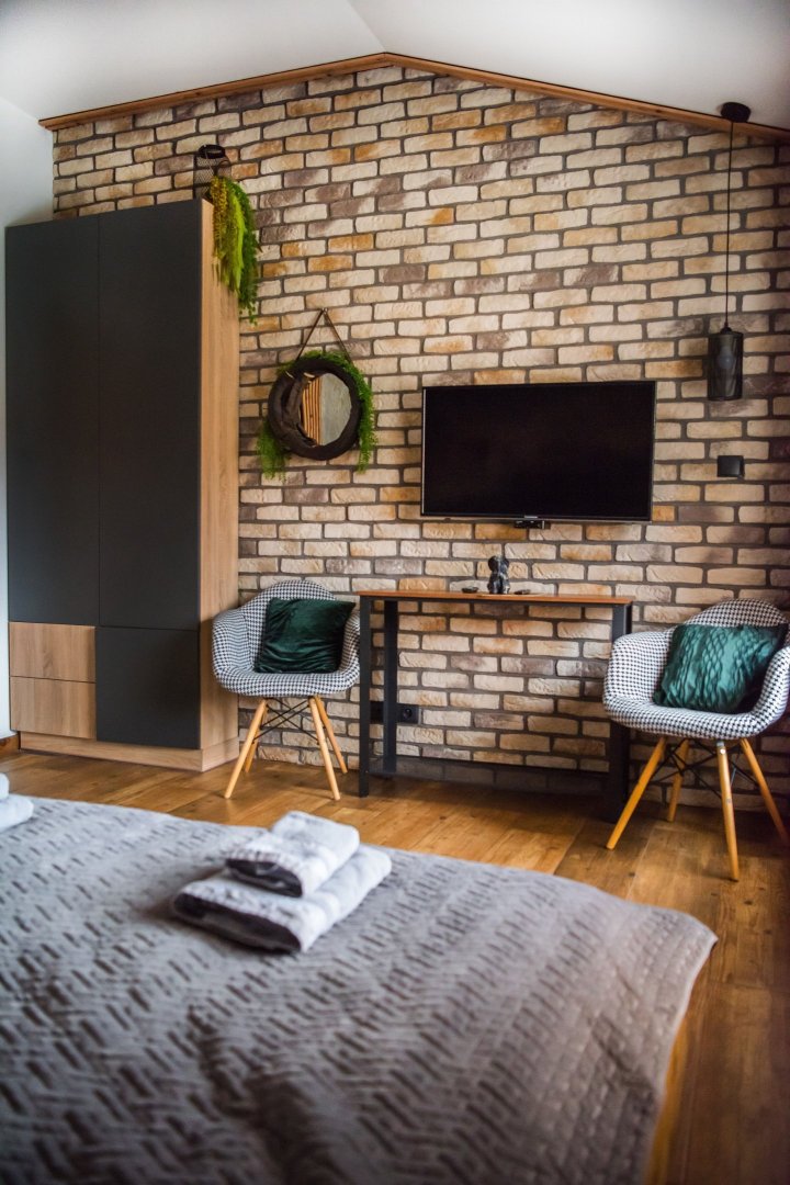 Wnętrze łączy w sobie naturalne drewno, cegłę i industrialne detale, a całości dopełniają ręcznie wykonane meble i dekoracje, które nadają apartamentowi wyjątkowy bieszczadzki charakter. Duże okna i balkon sprawiają, że przestrzeń jest jasna i otwarta, a wieczory można spędzać także na świeżym powietrzu.