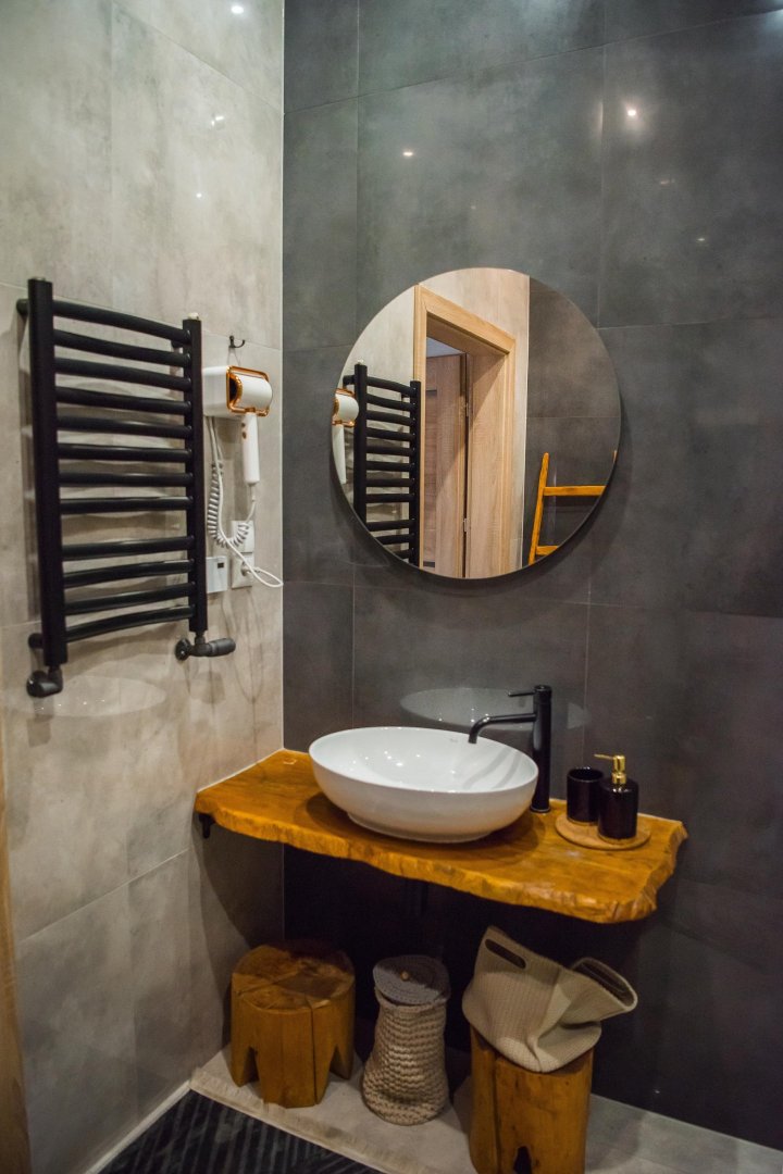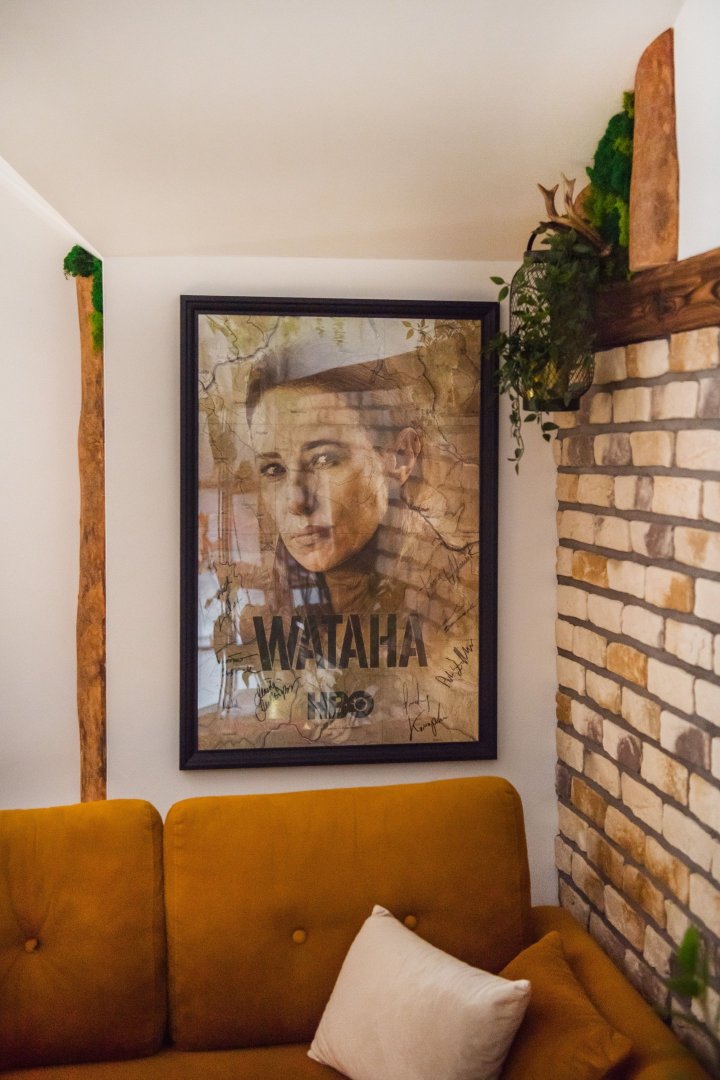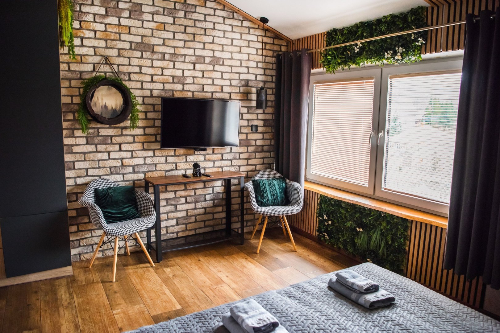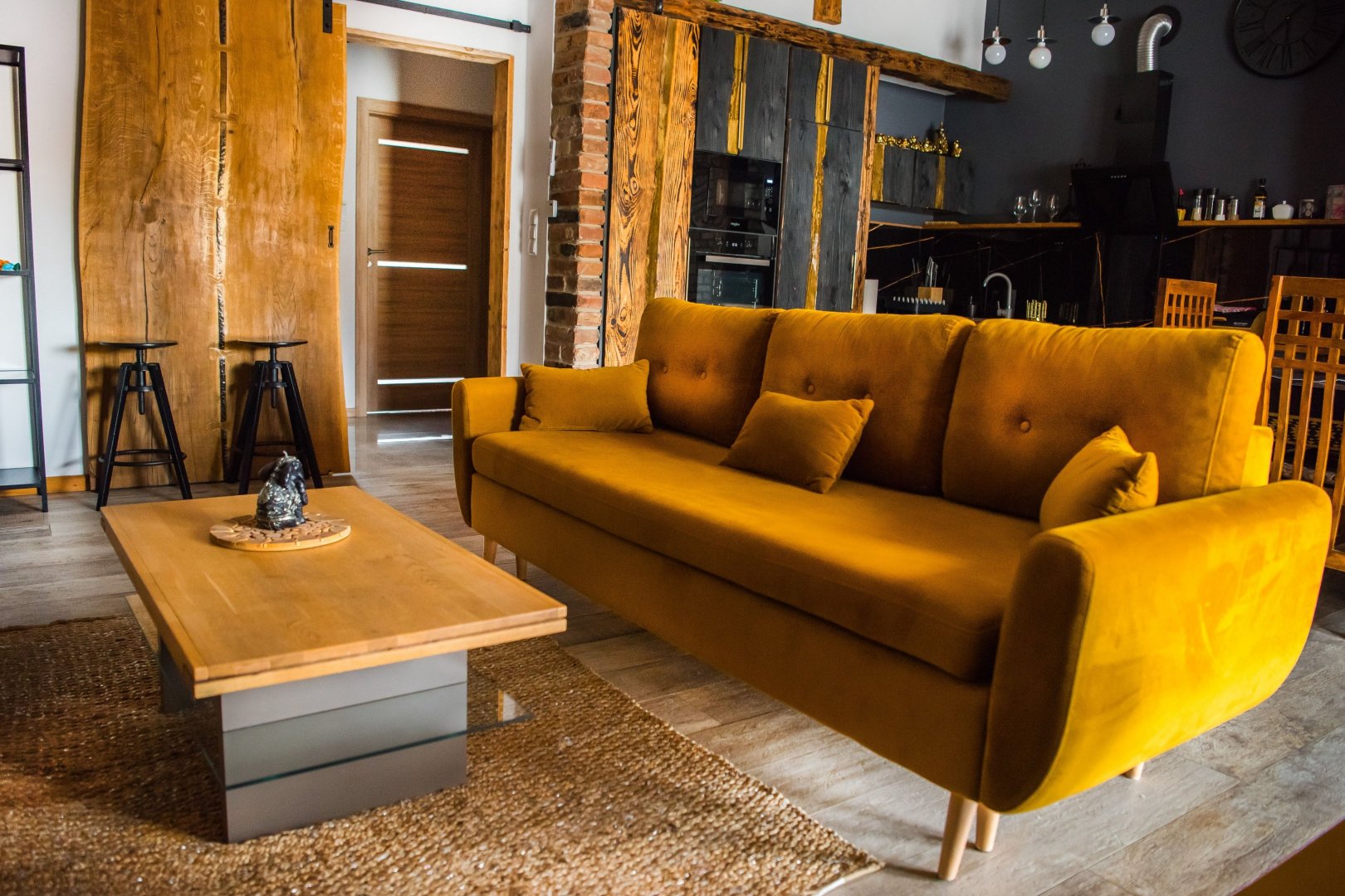 Wnętrze łączy w sobie naturalne drewno, cegłę i industrialne detale, a całości dopełniają ręcznie wykonane meble i dekoracje, które nadają apartamentowi wyjątkowy bieszczadzki charakter. Duże okna i balkon sprawiają, że przestrzeń jest jasna i otwarta, a wieczory można spędzać także na świeżym powietrzu.