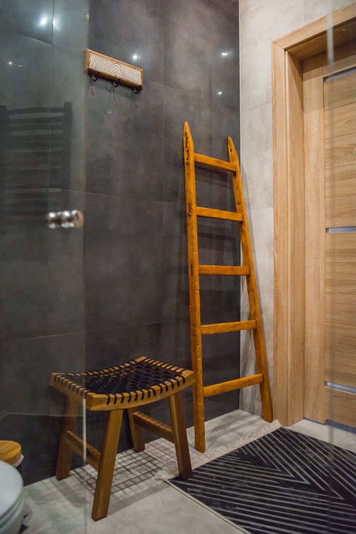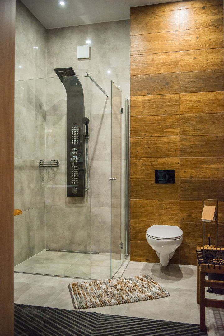 łazienkę z prysznicem – wygodną i nowoczesną, z naturalnymi drewnianymi akcentami