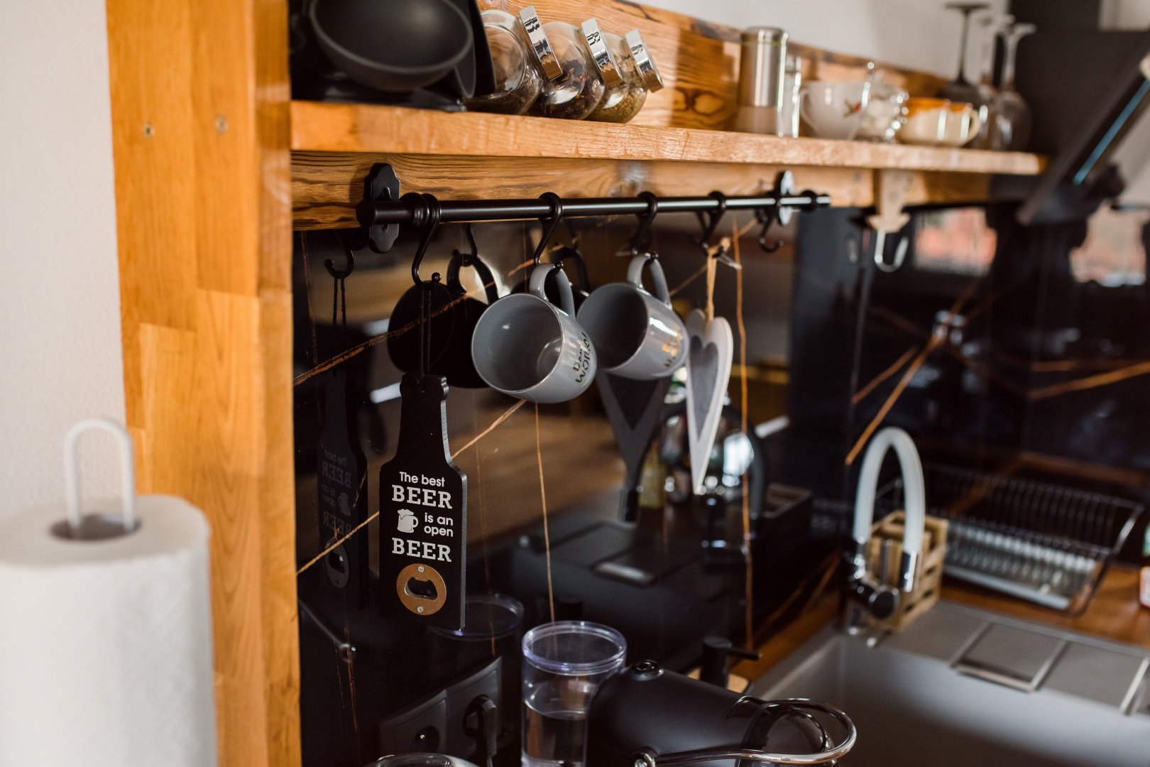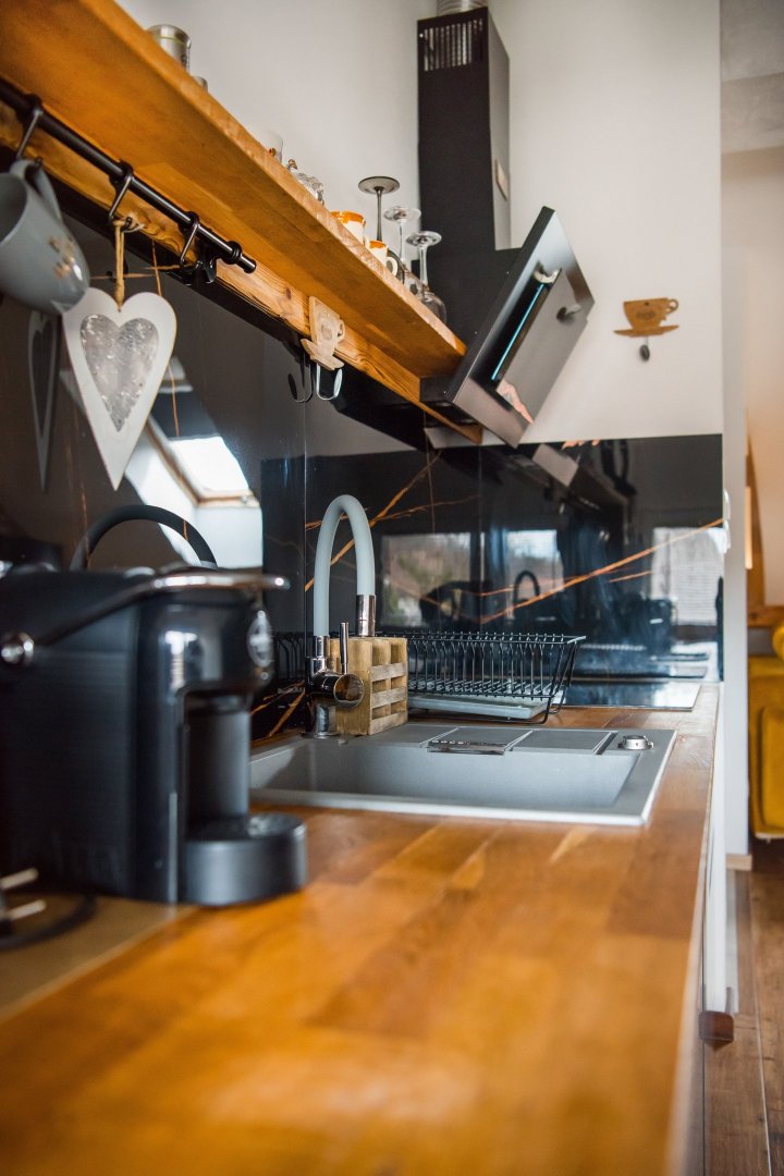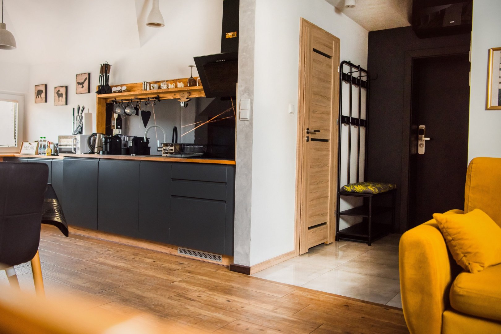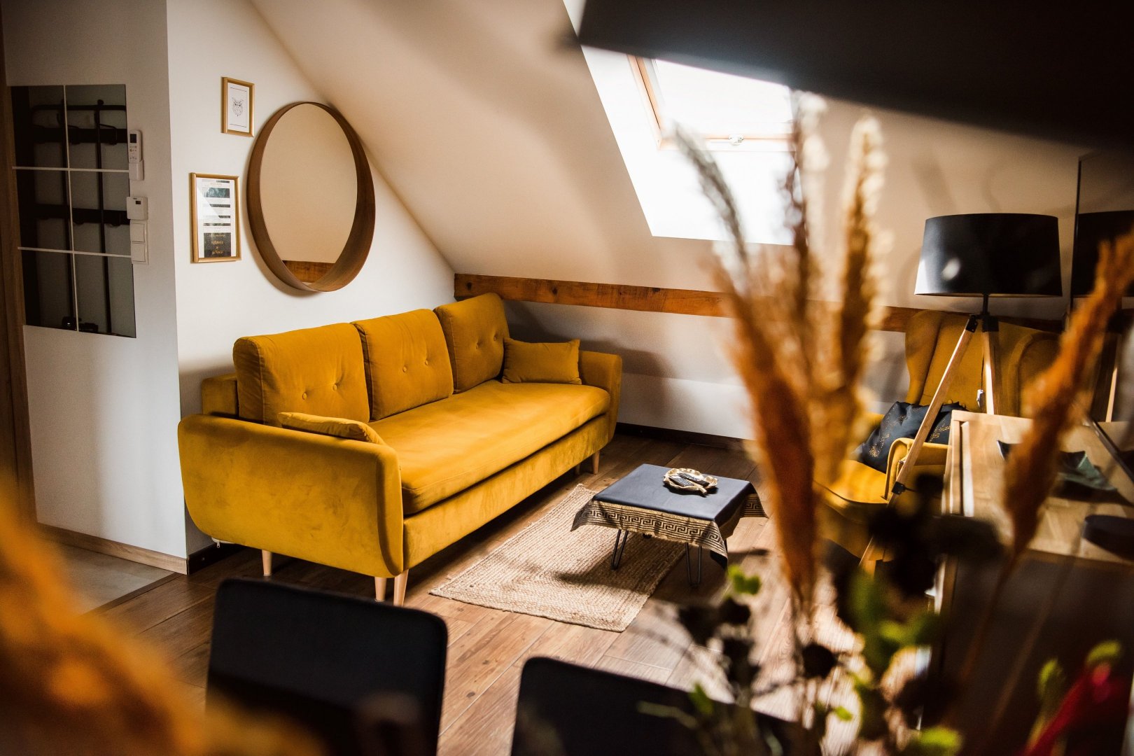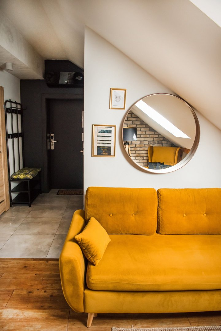 W części dziennej znajduje się salon z jadalnią i w pełni wyposażonym aneksem kuchennym. Musztardowa kanapa i wygodny fotel zachęcają, by usiąść z kubkiem herbaty
