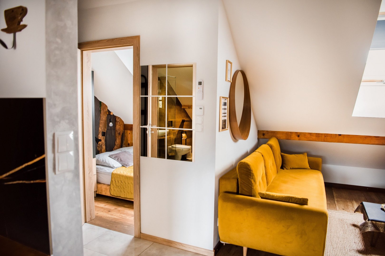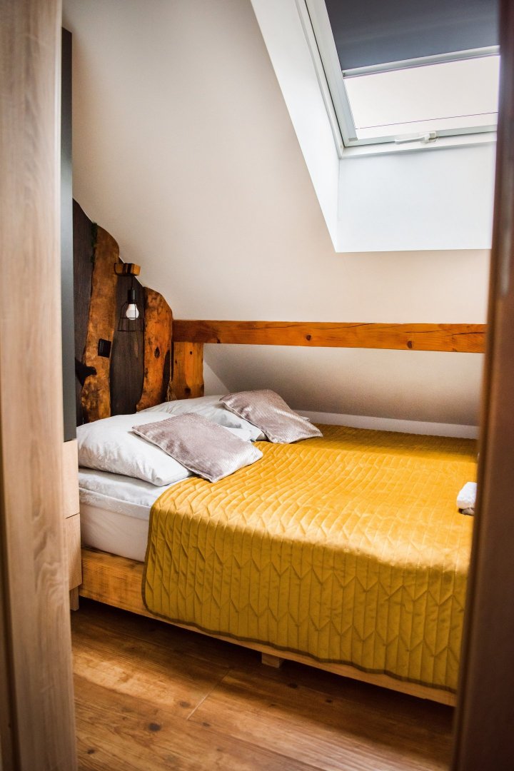 Apartament 23 przeznaczony dla 2–4 osób to jedyne w Poranku w Górach wnętrze urządzone na poddaszu — ze skosami, dużym oknem dachowym i wyjątkowo przytulnym klimatem